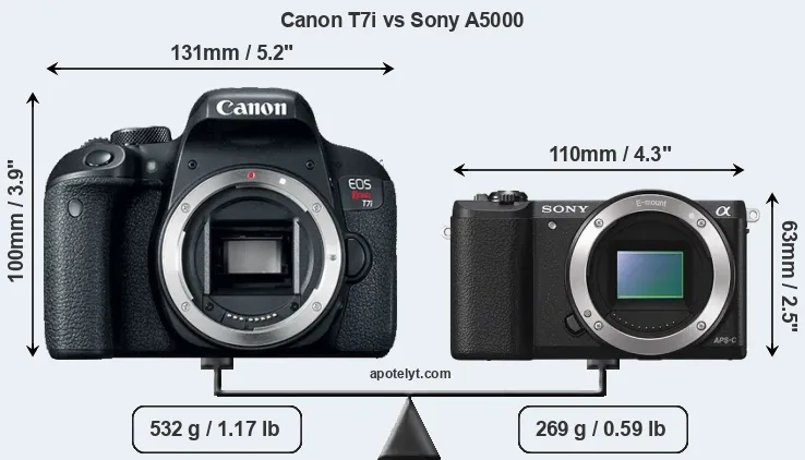 The physical size and weight of the Canon T7i and the Sony A5000 are illustrated in the side-by-side display below. The two cameras are presented according to their relative size. Three consecutive perspectives from the front, the top, and the back are available. All width, height and depth dimensions are rounded to the nearest millimeter.