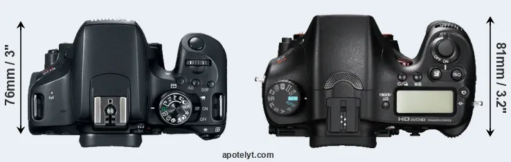 The side-by-side display below illustrates the physical size and weight of the Canon T7i and the Sony A77. The two cameras are presented according to their relative size. Three successive views from the front, the top, and the rear are shown. All size dimensions are rounded to the nearest millimeter.