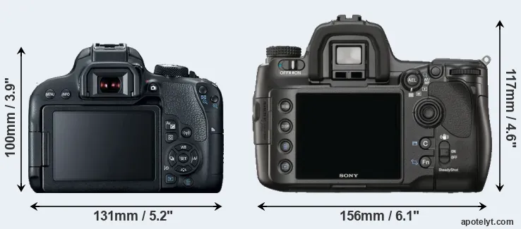 The physical size and weight of the Canon T7i and the Sony A900 are illustrated in the side-by-side display below. The two cameras are presented according to their relative size. Three consecutive perspectives from the front, the top, and the back are available. All width, height and depth measures are rounded to the nearest millimeter.