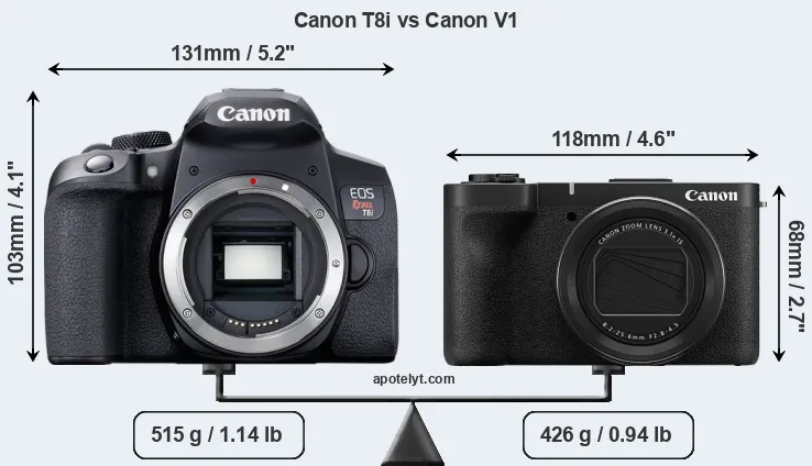 The side-by-side display below illustrates the physical size and weight of the Canon T8i and the Canon V1. The two cameras are presented according to their relative size. Three consecutive views from the front, the top, and the rear side are shown. All width, height and depth dimensions are rounded to the nearest millimeter.