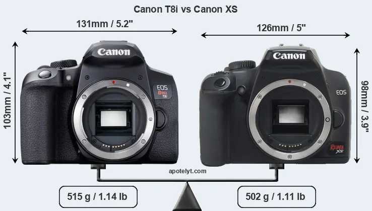 If the front view area (width x height) of the cameras is taken as an aggregate measure of their size, the Canon XS is notably smaller (8 percent) than the Canon T8i. Moreover, the XS is slightly lighter (3 percent) than the T8i. In this context, it is worth noting that neither the T8i nor the XS are weather-sealed.