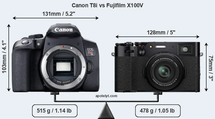 An illustration of the physical size and weight of the Canon T8i and the Fujifilm X100V is provided in the side-by-side display below. The two cameras are presented according to their relative size. Three consecutive views from the front, the top, and the rear side are shown. All width, height and depth dimensions are rounded to the nearest millimeter.