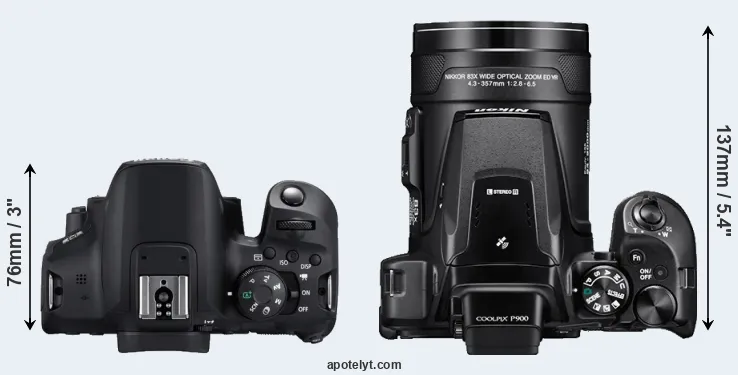 An illustration of the physical size and weight of the Canon T8i and the Nikon P900 is provided in the side-by-side display below. The two cameras are presented according to their relative size. Three successive views from the front, the top, and the rear are shown. All size dimensions are rounded to the nearest millimeter.