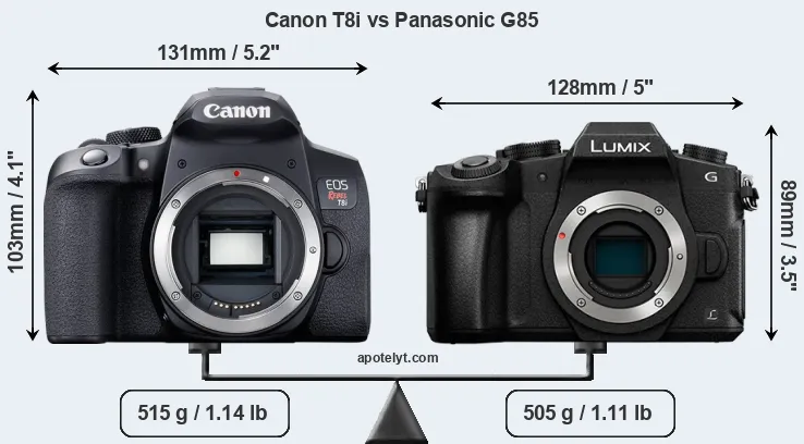 An illustration of the physical size and weight of the Canon T8i and the Panasonic G85 is provided in the side-by-side display below. The two cameras are presented according to their relative size. Three successive views from the front, the top, and the rear are shown. All size dimensions are rounded to the nearest millimeter.