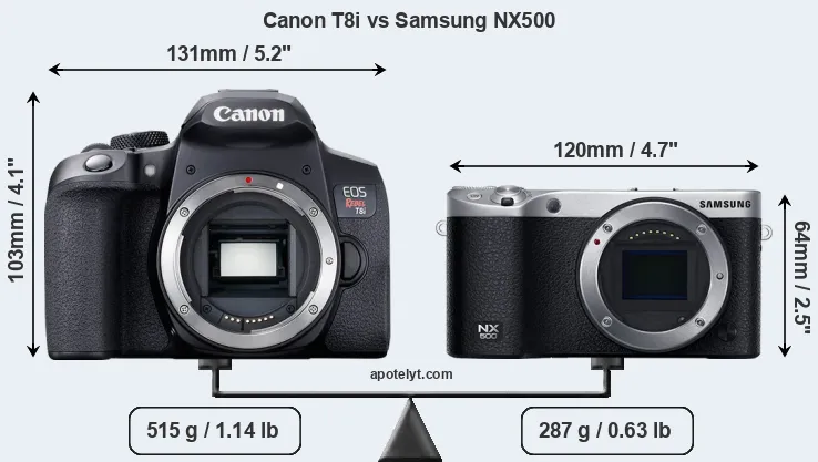 The side-by-side display below illustrates the physical size and weight of the Canon T8i and the Samsung NX500. The two cameras are presented according to their relative size. Three consecutive views from the front, the top, and the rear side are shown. All width, height and depth measures are rounded to the nearest millimeter.