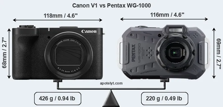 An illustration of the physical size and weight of the Canon V1 and the Pentax WG-1000 is provided in the side-by-side display below. The two cameras are presented according to their relative size. Three successive views from the front, the top, and the rear are shown. All size dimensions are rounded to the nearest millimeter.