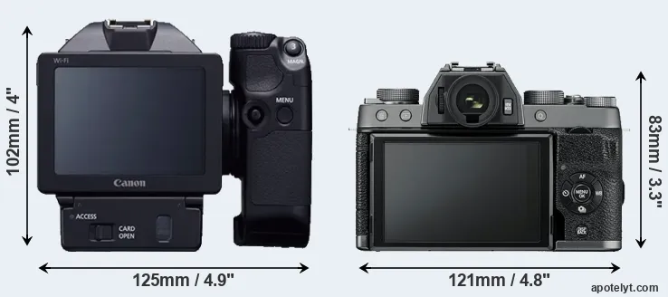 The side-by-side display below illustrates the physical size and weight of the Canon XC10 and the Fujifilm X-T100. The two cameras are presented according to their relative size. Three consecutive perspectives from the front, the top, and the back are available. All width, height and depth dimensions are rounded to the nearest millimeter.