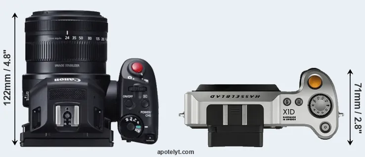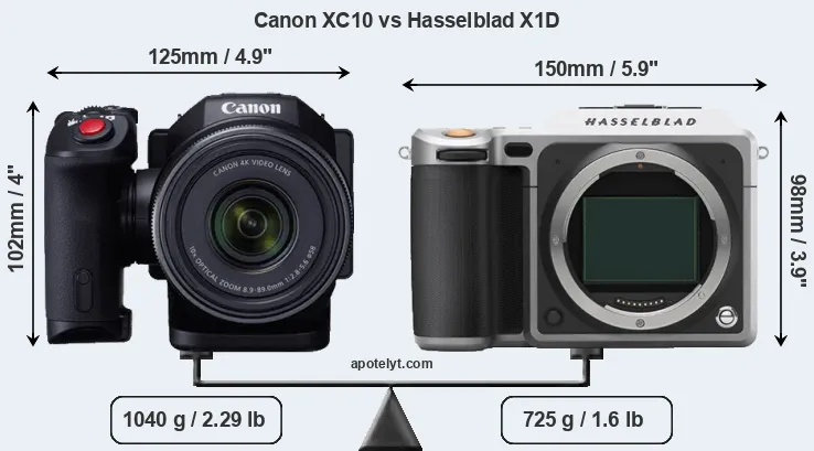An illustration of the physical size and weight of the Canon XC10 and the Hasselblad X1D is provided in the side-by-side display below. The two cameras are presented according to their relative size. Three successive views from the front, the top, and the rear are shown. All width, height and depth measures are rounded to the nearest millimeter.