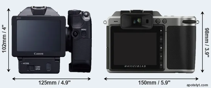 If the front view area (width x height) of the cameras is taken as an aggregate measure of their size, the Hasselblad X1D is notably larger (15 percent) than the Canon XC10. It is noteworthy in this context that the X1D is splash and dust-proof, while the XC10 does not feature any corresponding weather-sealing.