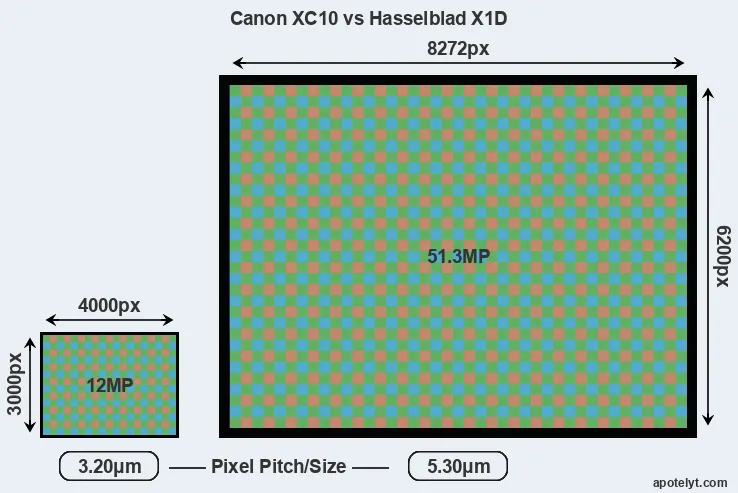 With 51.3MP, the X1D offers a higher resolution than the XC10 (12MP), but the X1D nevertheless has larger individual pixels (pixel pitch of 5.30μm versus 3.20μm for the XC10) due to its larger sensor. Moreover, the X1D is a somewhat more recent model (by 1 year and 2 months) than the XC10, and its sensor might have benefitted from technological advances during this time that further enhance the light gathering capacity of its pixel-units. Coming back to sensor resolution, it should be mentioned that the X1D has no anti-alias filter installed, so that it can capture all the detail its sensor resolves.