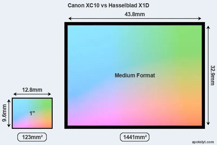 Of the two cameras under consideration, the Canon XC10 features an one-inch sensor and the Hasselblad X1D a medium format sensor. The sensor area in the X1D is 1072 percent bigger. As a result of these sensor size differences, the cameras have a format factor of, respectively, 2.75 and 0.79. Both cameras feature a native aspect ratio (sensor width to sensor height) of 4:3.