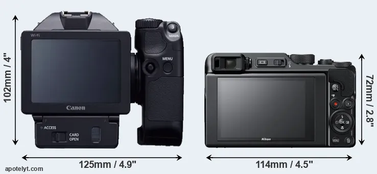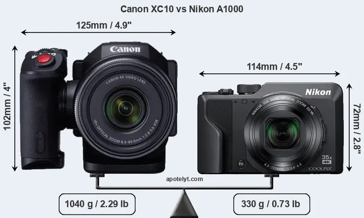 The physical size and weight of the Canon XC10 and the Nikon A1000 are illustrated in the side-by-side display below. The two cameras are presented according to their relative size. Three successive views from the front, the top, and the rear are shown. All width, height and depth measures are rounded to the nearest millimeter.