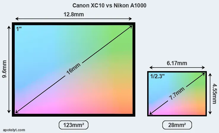 Of the two cameras under consideration, the Canon XC10 features an one-inch sensor and the Nikon A1000 a 1/2.3-inch sensor. The sensor area in the A1000 is 77 percent smaller. As a result of these sensor size differences, the cameras have a format factor of, respectively, 2.75 and 5.6. Both cameras feature a native aspect ratio (sensor width to sensor height) of 4:3.