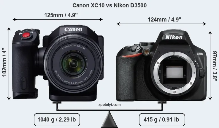 The side-by-side display below illustrates the physical size and weight of the Canon XC10 and the Nikon D3500. The two cameras are presented according to their relative size. Three consecutive perspectives from the front, the top, and the back are available. All size dimensions are rounded to the nearest millimeter.