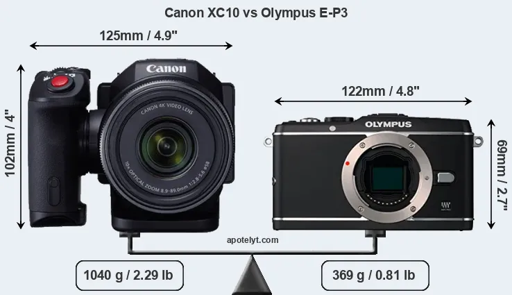 If the front view area (width x height) of the cameras is taken as an aggregate measure of their size, the Olympus E-P3 is considerably smaller (34 percent) than the Canon XC10. In this context, it is worth noting that neither the XC10 nor the E-P3 are weather-sealed.