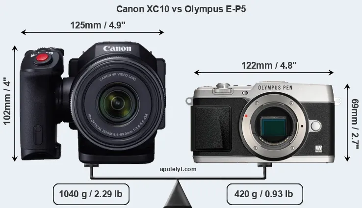 If the front view area (width x height) of the cameras is taken as an aggregate measure of their size, the Olympus E-P5 is considerably smaller (34 percent) than the Canon XC10. In this context, it is worth noting that neither the XC10 nor the E-P5 are weather-sealed.