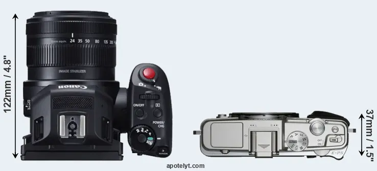 The physical size and weight of the Canon XC10 and the Olympus E-P5 are illustrated in the side-by-side display below. The two cameras are presented according to their relative size. Three consecutive views from the front, the top, and the rear side are shown. All size dimensions are rounded to the nearest millimeter.