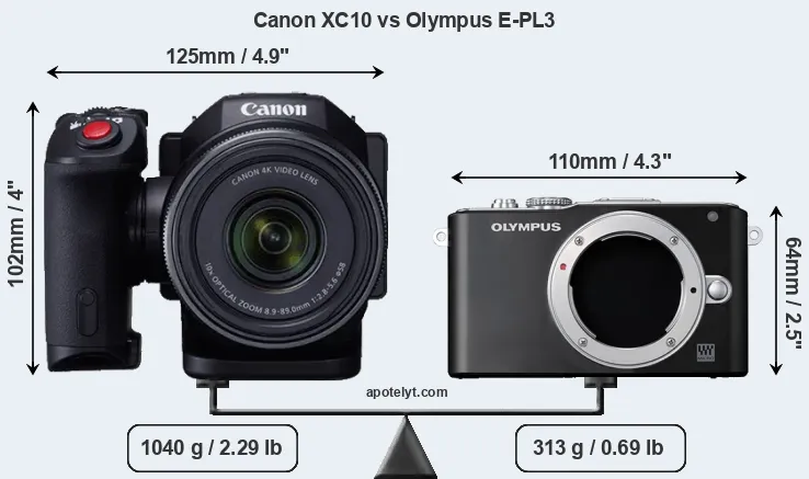 The physical size and weight of the Canon XC10 and the Olympus E-PL3 are illustrated in the side-by-side display below. The two cameras are presented according to their relative size. Three successive views from the front, the top, and the rear are shown. All width, height and depth measures are rounded to the nearest millimeter.