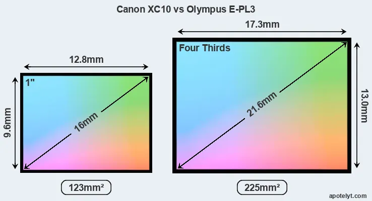 Of the two cameras under consideration, the Canon XC10 features an one-inch sensor and the Olympus E-PL3 a Four Thirds sensor. The sensor area in the E-PL3 is 83 percent bigger. As a result of these sensor size differences, the cameras have a format factor of, respectively, 2.75 and 2.0. Both cameras feature a native aspect ratio (sensor width to sensor height) of 4:3.