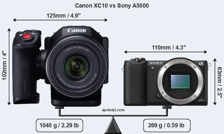 If the front view area (width x height) of the cameras is taken as an aggregate measure of their size, the Sony A5000 is considerably smaller (46 percent) than the Canon XC10. In this context, it is worth noting that neither the XC10 nor the A5000 are weather-sealed.