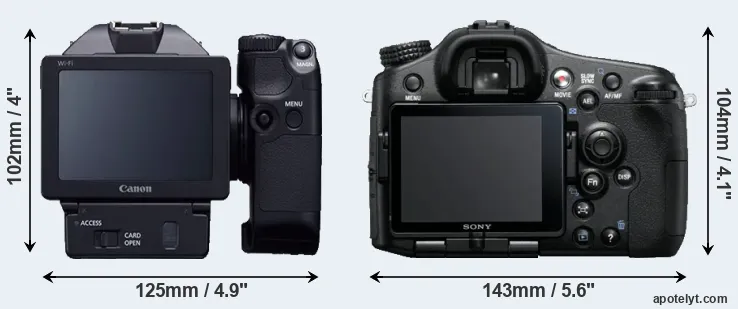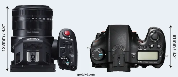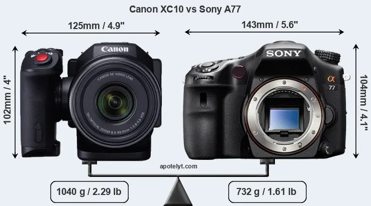 The side-by-side display below illustrates the physical size and weight of the Canon XC10 and the Sony A77. The two cameras are presented according to their relative size. Three consecutive views from the front, the top, and the rear side are shown. All width, height and depth dimensions are rounded to the nearest millimeter.