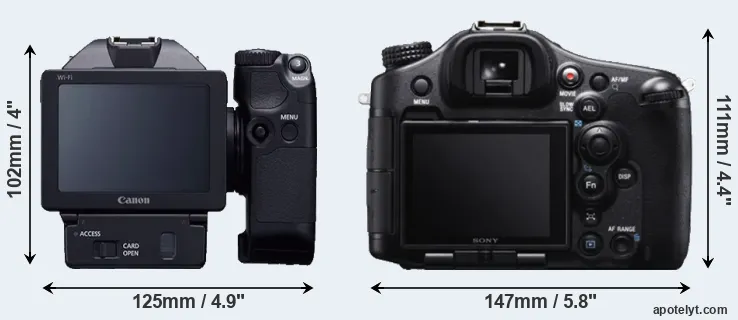 The side-by-side display below illustrates the physical size and weight of the Canon XC10 and the Sony A99. The two cameras are presented according to their relative size. Three consecutive views from the front, the top, and the rear side are shown. All width, height and depth dimensions are rounded to the nearest millimeter.