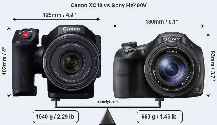 If the front view area (width x height) of the cameras is taken as an aggregate measure of their size, the Sony HX400V is notably smaller (5 percent) than the Canon XC10. Moreover, the HX400V is substantially lighter (37 percent) than the XC10. In this context, it is worth noting that neither the XC10 nor the HX400V are weather-sealed.