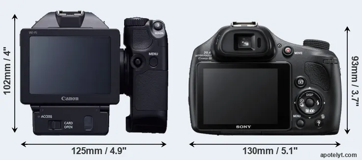 The physical size and weight of the Canon XC10 and the Sony HX400V are illustrated in the side-by-side display below. The two cameras are presented according to their relative size. Three consecutive perspectives from the front, the top, and the back are available. All width, height and depth dimensions are rounded to the nearest millimeter.