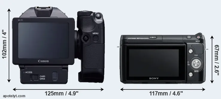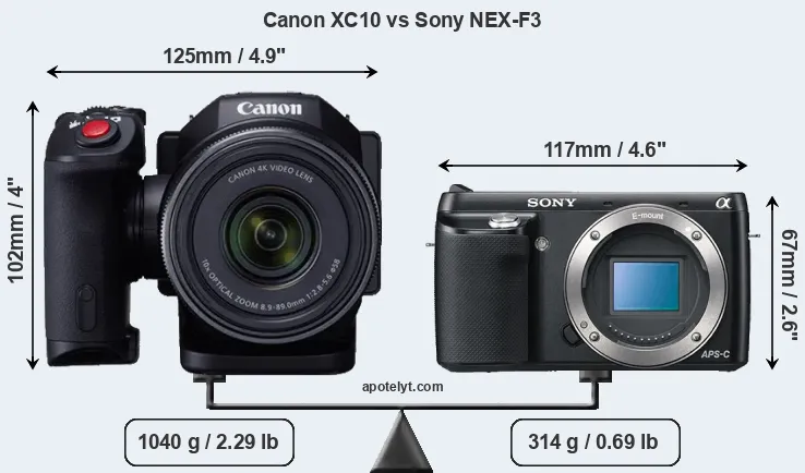 If the front view area (width x height) of the cameras is taken as an aggregate measure of their size, the Sony NEX-F3 is considerably smaller (39 percent) than the Canon XC10. In this context, it is worth noting that neither the XC10 nor the NEX-F3 are weather-sealed.