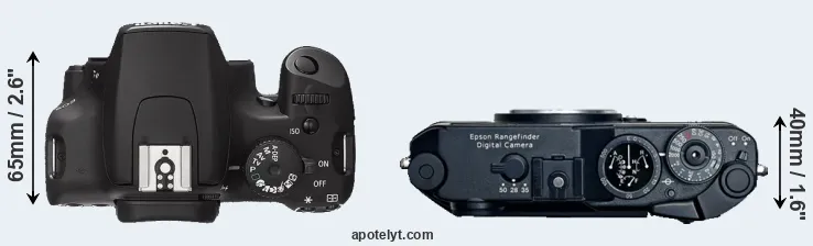 The side-by-side display below illustrates the physical size and weight of the Canon XS and the Epson R-D1. The two cameras are presented according to their relative size. Three consecutive perspectives from the front, the top, and the back are available. All width, height and depth dimensions are rounded to the nearest millimeter.
