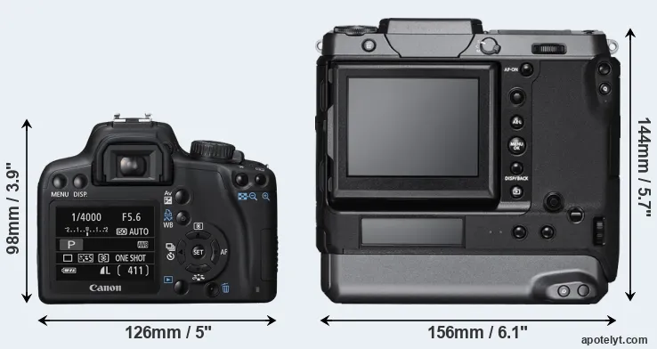 The side-by-side display below illustrates the physical size and weight of the Canon XS and the Fujifilm GFX 100. The two cameras are presented according to their relative size. Three successive views from the front, the top, and the rear are shown. All width, height and depth dimensions are rounded to the nearest millimeter.