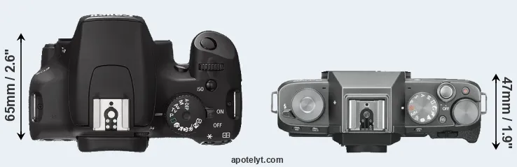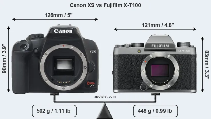 The side-by-side display below illustrates the physical size and weight of the Canon XS and the Fujifilm X-T100. The two cameras are presented according to their relative size. Three consecutive perspectives from the front, the top, and the back are available. All width, height and depth dimensions are rounded to the nearest millimeter.