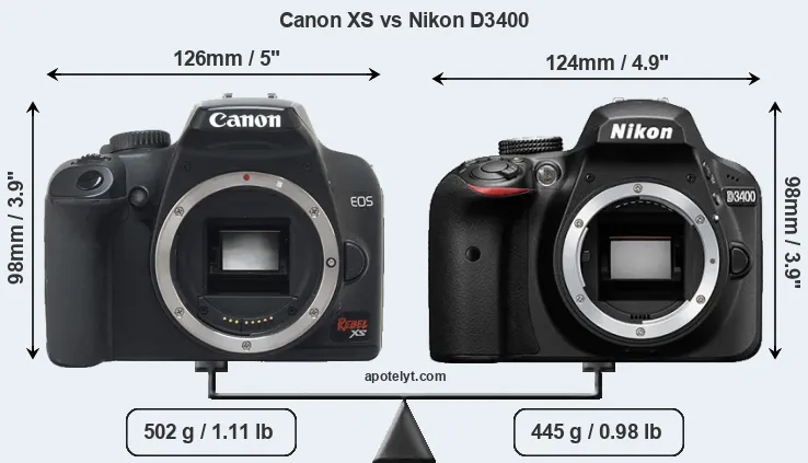 An illustration of the physical size and weight of the Canon XS and the Nikon D3400 is provided in the side-by-side display below. The two cameras are presented according to their relative size. Three successive views from the front, the top, and the rear are shown. All width, height and depth dimensions are rounded to the nearest millimeter.
