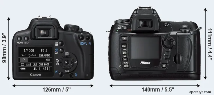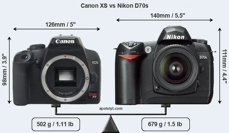 If the front view area (width x height) of the cameras is taken as an aggregate measure of their size, the Nikon D70s is notably larger (26 percent) than the Canon XS. Moreover, the D70s is substantially heavier (35 percent) than the XS. In this context, it is worth noting that neither the XS nor the D70s are weather-sealed.