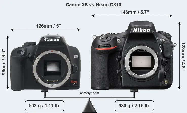 If the front view area (width x height) of the cameras is taken as an aggregate measure of their size, the Nikon D810 is considerably larger (45 percent) than the Canon XS. Moreover, the D810 is substantially heavier (95 percent) than the XS. It is noteworthy in this context that the D810 is splash and dust-proof, while the XS does not feature any corresponding weather-sealing.