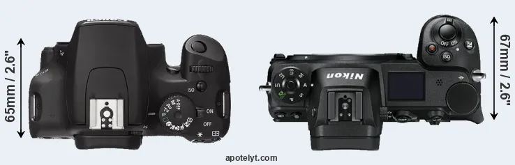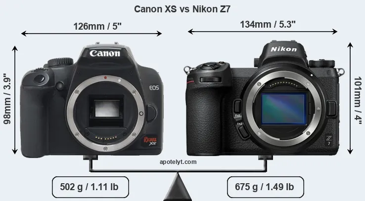 The physical size and weight of the Canon XS and the Nikon Z7 are illustrated in the side-by-side display below. The two cameras are presented according to their relative size. Three consecutive perspectives from the front, the top, and the back are available. All width, height and depth dimensions are rounded to the nearest millimeter.