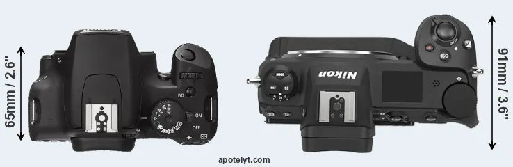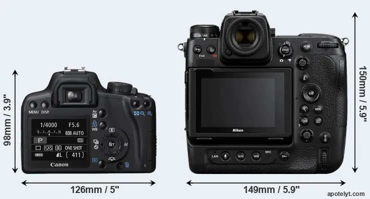 The side-by-side display below illustrates the physical size and weight of the Canon XS and the Nikon Z9. The two cameras are presented according to their relative size. Three successive views from the front, the top, and the rear are shown. All width, height and depth measures are rounded to the nearest millimeter.