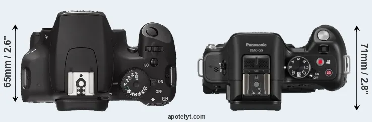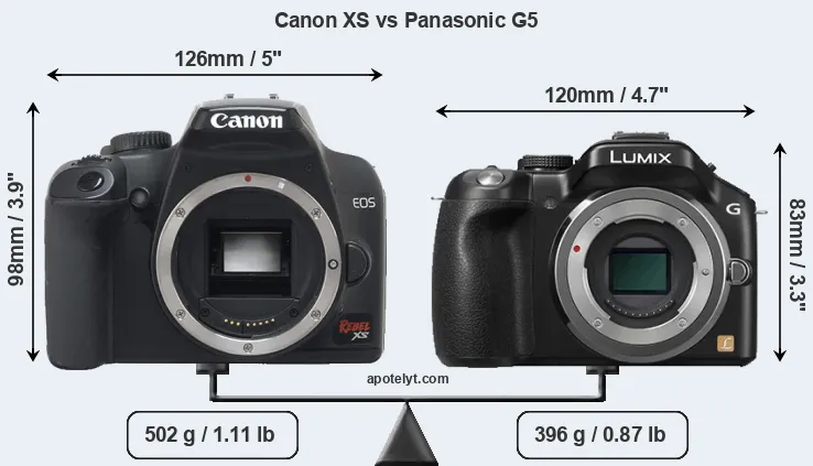 The side-by-side display below illustrates the physical size and weight of the Canon XS and the Panasonic G5. The two cameras are presented according to their relative size. Three consecutive perspectives from the front, the top, and the back are available. All width, height and depth measures are rounded to the nearest millimeter.