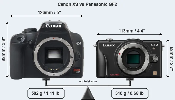 The side-by-side display below illustrates the physical size and weight of the Canon XS and the Panasonic GF2. The two cameras are presented according to their relative size. Three consecutive perspectives from the front, the top, and the back are available. All size dimensions are rounded to the nearest millimeter.