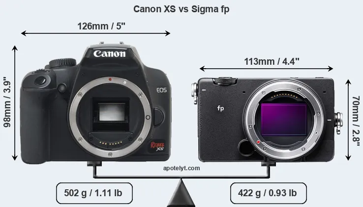 If the front view area (width x height) of the cameras is taken as an aggregate measure of their size, the Sigma fp is considerably smaller (36 percent) than the Canon XS. Moreover, the fp is markedly lighter (16 percent) than the XS. It is noteworthy in this context that the fp is splash and dust-proof, while the XS does not feature any corresponding weather-sealing.