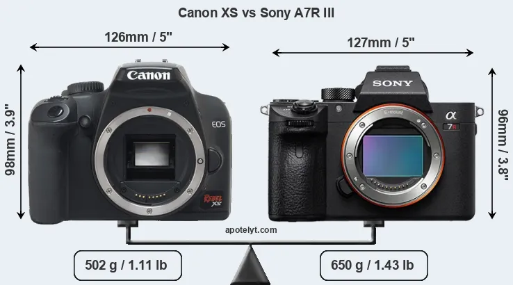 If the front view area (width x height) of the cameras is taken as an aggregate measure of their size, the Sony A7R III is somewhat smaller (1 percent) than the Canon XS. However, the A7R III is markedly heavier (29 percent) than the XS. It is noteworthy in this context that the A7R III is splash and dust-proof, while the XS does not feature any corresponding weather-sealing.