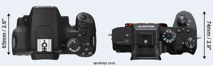 The side-by-side display below illustrates the physical size and weight of the Canon XS and the Sony A7R III. The two cameras are presented according to their relative size. Three successive views from the front, the top, and the rear are shown. All size dimensions are rounded to the nearest millimeter.