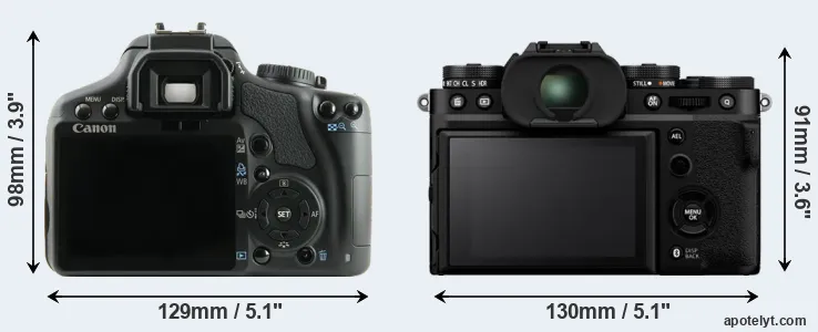 The side-by-side display below illustrates the physical size and weight of the Canon XSi and the Fujifilm X-T5. The two cameras are presented according to their relative size. Three successive views from the front, the top, and the rear are shown. All size dimensions are rounded to the nearest millimeter.