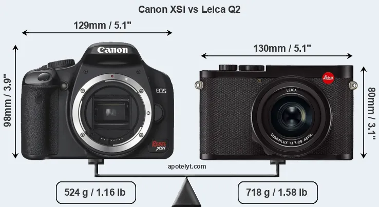 An illustration of the physical size and weight of the Canon XSi and the Leica Q2 is provided in the side-by-side display below. The two cameras are presented according to their relative size. Three successive views from the front, the top, and the rear are shown. All width, height and depth measures are rounded to the nearest millimeter.