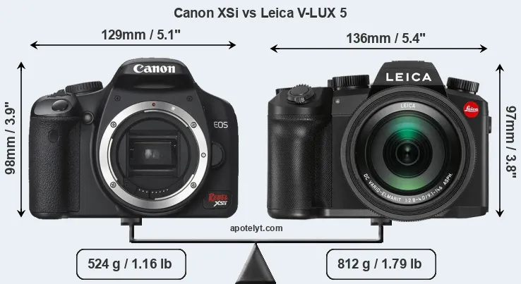 The side-by-side display below illustrates the physical size and weight of the Canon XSi and the Leica V-LUX 5. The two cameras are presented according to their relative size. Three successive views from the front, the top, and the rear are shown. All size dimensions are rounded to the nearest millimeter.