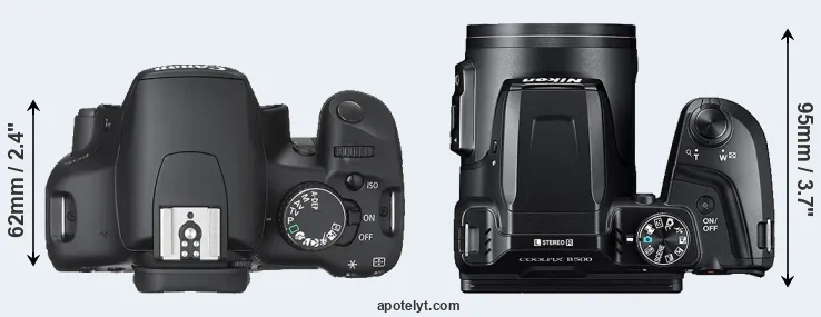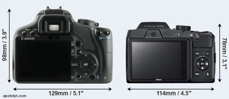 The side-by-side display below illustrates the physical size and weight of the Canon XSi and the Nikon B500. The two cameras are presented according to their relative size. Three successive views from the front, the top, and the rear are shown. All width, height and depth measures are rounded to the nearest millimeter.