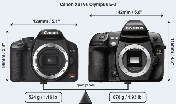 If the front view area (width x height) of the cameras is taken as an aggregate measure of their size, the Olympus E-3 is notably larger (30 percent) than the Canon XSi. Moreover, the E-3 is substantially heavier (67 percent) than the XSi. It is noteworthy in this context that the E-3 is splash and dust-proof, while the XSi does not feature any corresponding weather-sealing.