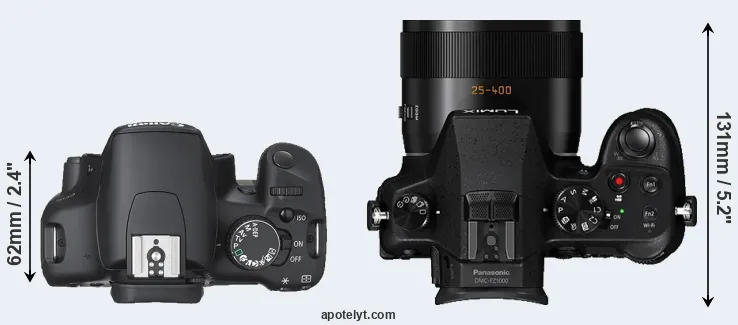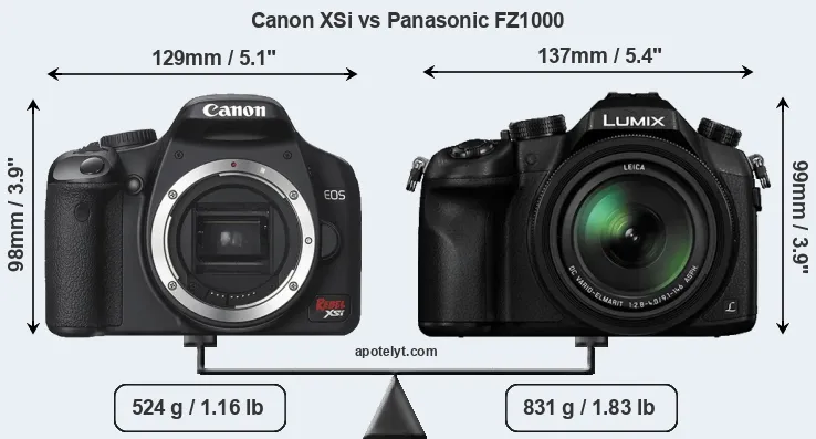 An illustration of the physical size and weight of the Canon XSi and the Panasonic FZ1000 is provided in the side-by-side display below. The two cameras are presented according to their relative size. Three consecutive views from the front, the top, and the rear side are shown. All width, height and depth measures are rounded to the nearest millimeter.