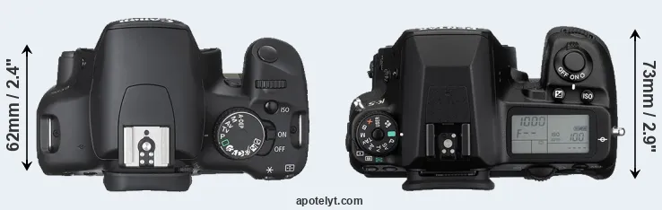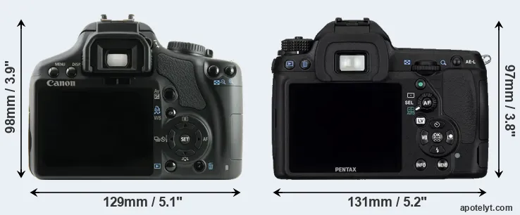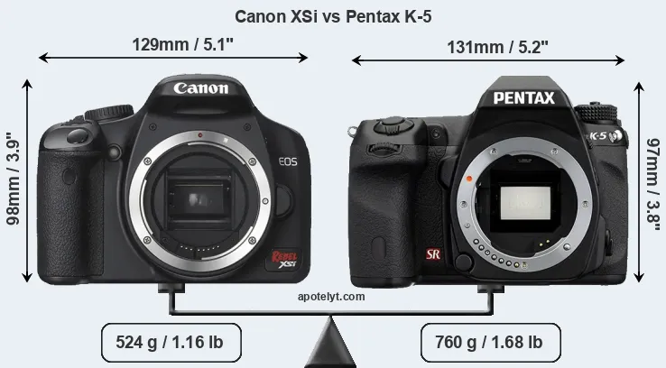 The side-by-side display below illustrates the physical size and weight of the Canon XSi and the Pentax K-5. The two cameras are presented according to their relative size. Three successive views from the front, the top, and the rear are shown. All width, height and depth dimensions are rounded to the nearest millimeter.