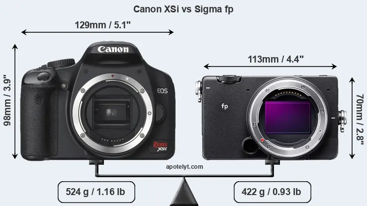 An illustration of the physical size and weight of the Canon XSi and the Sigma fp is provided in the side-by-side display below. The two cameras are presented according to their relative size. Three successive views from the front, the top, and the rear are shown. All size dimensions are rounded to the nearest millimeter.